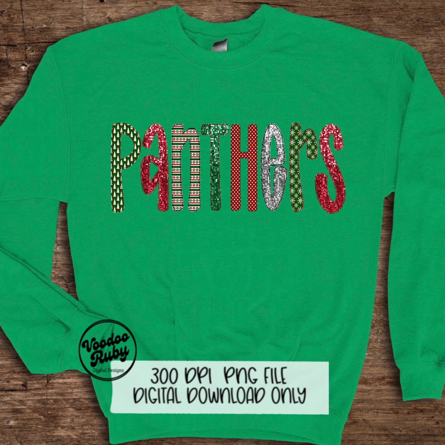 Christmas Panthers PNG: Faux Embroidery, Sequins Design (Digital Download)