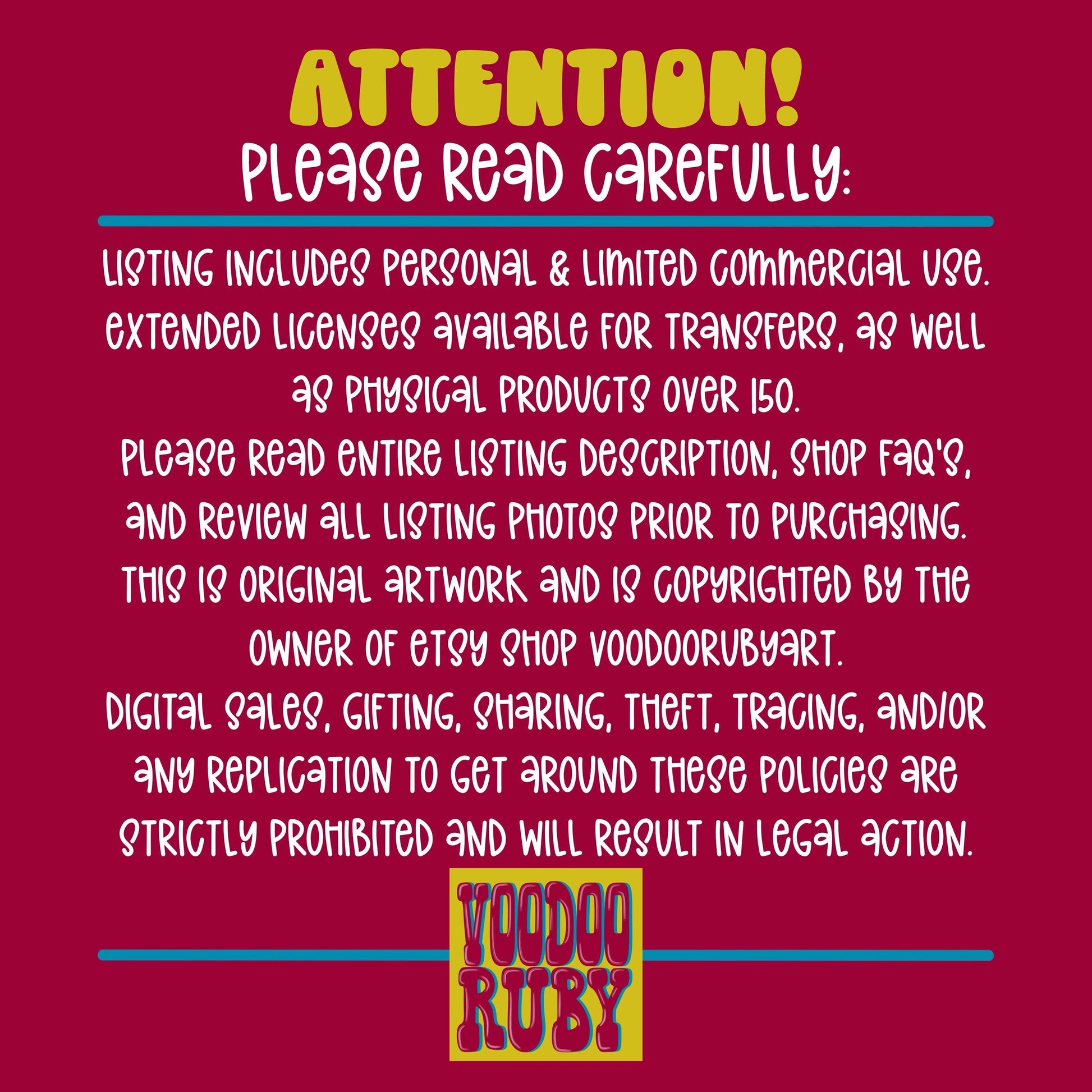 REMINDER: If you would like to sell printed transfers you MUST purchase an extended license in a separate listing here in my design shop, VoodooRubyArt (formerly CreativeChaosByAnna).