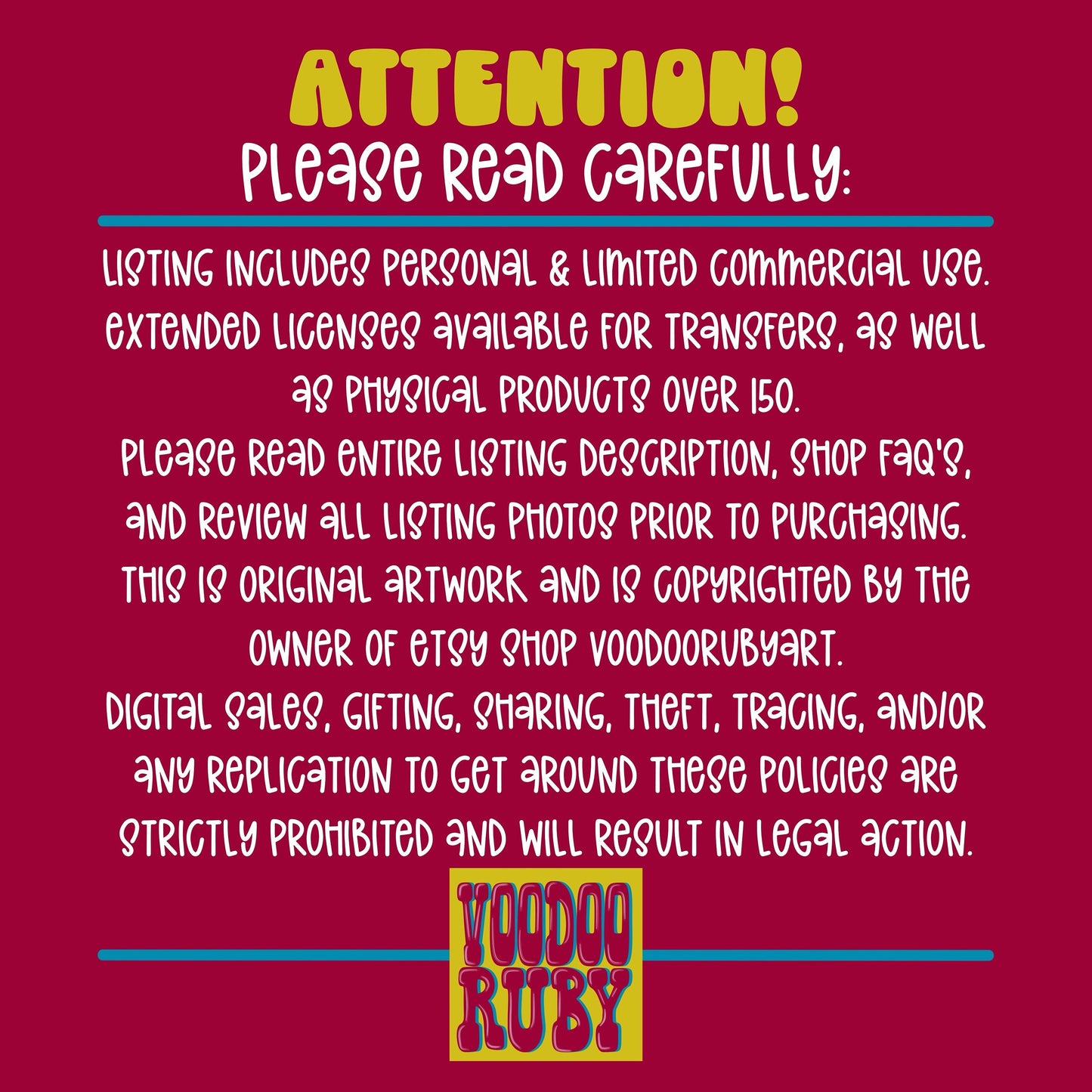REMINDER: Extended licenses available for selling printed transfers. This design and all other designs in my shop are copyrighted by VoodooRubyArt owner Anna Terry. Infringement in any form will result in legal action.